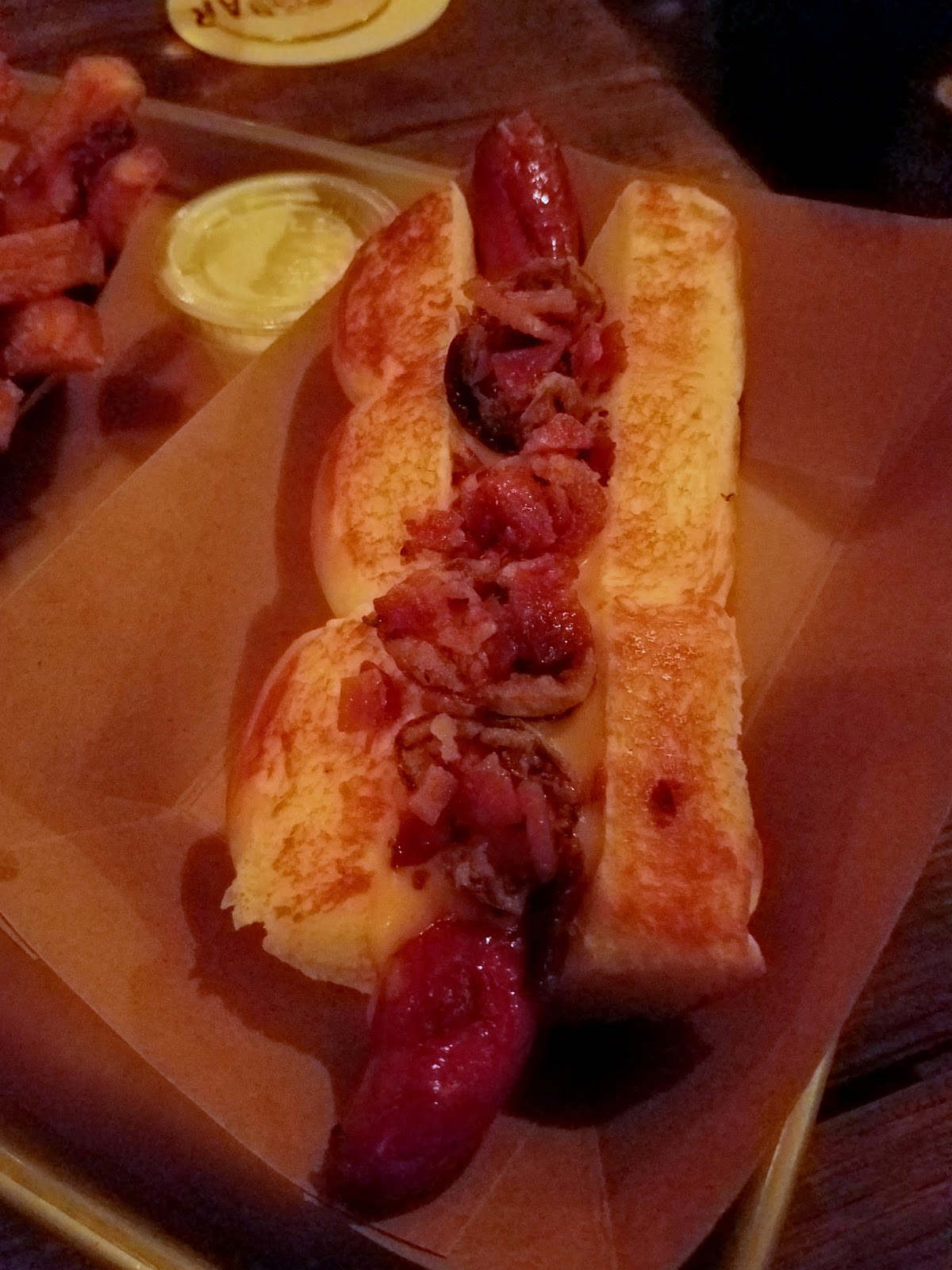 | One of the weekly specials "Pop Goes the Wiener" with bacon, fried jalapenos, and cheddar cheese sauce |